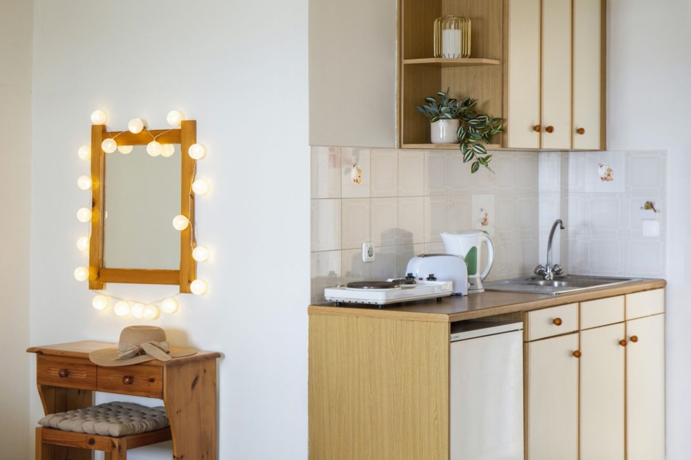 The one and only triple studio on the 2nd floor of Searocco Studios & Apartments offers magnificent views of the sea. In an area of 40 sq. m., 3 people will benefit from a double and a single bed, a useful kitchenette and a bathroom with a bathtub. From the furnished balcony of the studio, you can relax, gazing at the views of the sea and the beautiful area of Alykes.